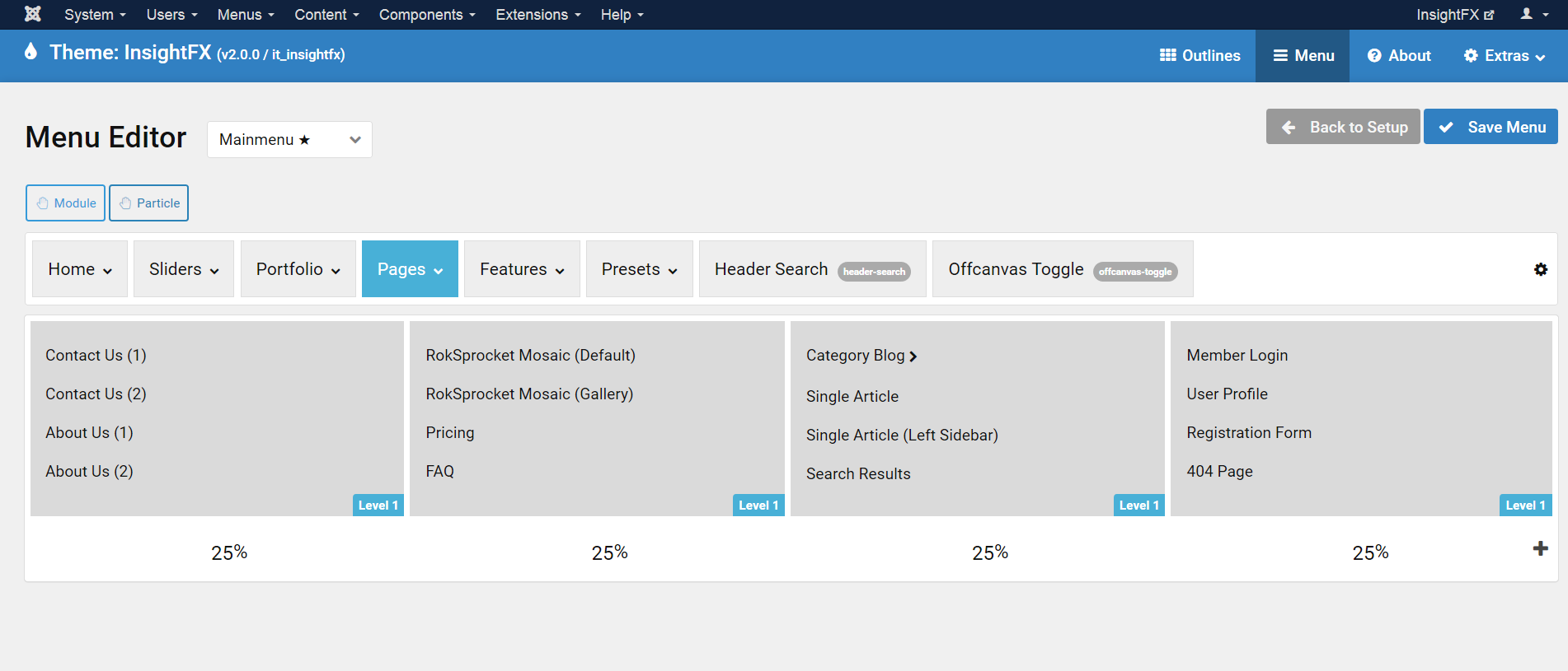 Gantry 5 features an advanced and user friendly Menu Editor, which augments the core menu with a rich, drag and drop enhanced interface, to easily change the menu's frontend appearance, such as columns.